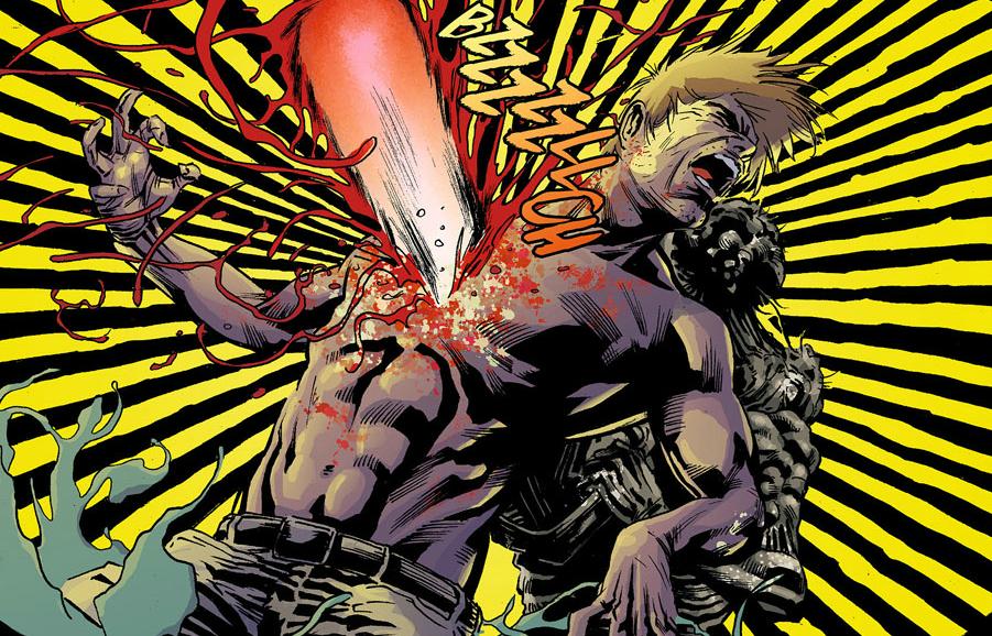 Alec refuses to listen, futilely trying to save Abby who first asks for an Aliens 3 mercy killing, then forces Alec to flee before she finally succumbs fully to the rot. Alec makes his escape on a motorcycle, using Abby’s shotgun to take down the zombie-bird-men the rot has sent for him. He makes it to a silent patch of swamp where he strips down and tells the parliament he is finally ready to become Swamp Thing. “Too late,” they tell him, “you have failed us.” As if Alec wasn’t having a bad enough day, he is then chainsawed through the back by a zombie. A zombie with a chainsaw. Have I mentioned that I love comics?