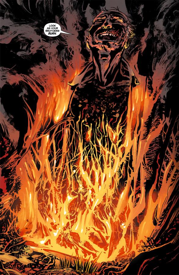In spite of all the awesomeness, there was one sequence that didn’t really work for me: William’s extended chess metaphor. It’s classic Snyder; a seemingly inane memory takes on a load of subtext in its telling, but it felt a little forced here. The accompanying images are compelling enough to make up the difference, and the chess queen made of human bodies is sufficiently horrifying, but the metaphor felt neither natural nor appropriate. I know what he’s going for…I just don’t think he landed it. I suppose I’m only disappointed because I know what Snyder is capable of. That would be an unfair standard for anyone else, but given how good I know he can be, it’s a bit of a let down when he fails to live up to himself.