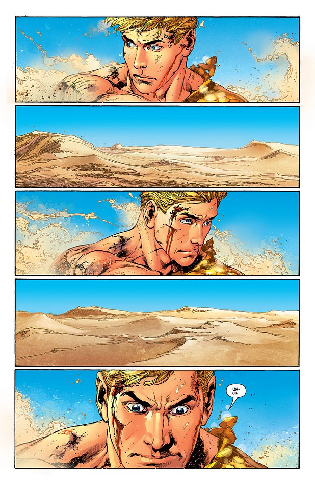 Shelby: Well Peter, I am certainly more excited and enticed than I was after the end of issue 4. Before I explore this issue further, let me digress a bit on why I’m reading Aquaman in the first place. I approached the New 52 riding the high of Blackest Night/Brightest Day, and never in my life have I been more excited for Aquaman. I loved what Johns did with him, and I wanted more! I would be lying to say I wasn’t disappointed by The Trench arc; I loved the self-awareness, the “yeah, we know Aquaman sucks” shtick, but I found the story to ultimately be a let-down. But then BAM! Desert! I was immediately wowed by the opening page; just 3 panels of tiny, defenseless Aquaman falling thru a blue, blue sky before a “thoom” of an impact. Delightful. In the third panel, we can even see that “oh, shit” moment when he realizes what exactly is about to happen. Another homerun for Reis.