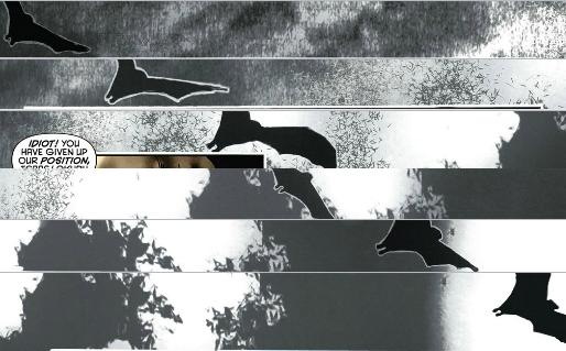 You’re right to site Reber’s colors as a big player in the feel of this book — his painterly touches make the art look like nothing else we’re reading. While I agree with you that Oliver’s faces and attention to detail far outpace ChrisCross’s work on the issue 4, I do think Oliver could learn a thing or two from ChrisCross when it comes to layouts. In general, the layouts on this title don’t feel particularly meaningful, but check out the page borders in issue 4: the silhouette of a bat traces its way across the top border as the issue progresses, symbolizing David’s own journey from mindless killing machine to Batman-endorsed crime-fighter. Or maybe I was just bored with the heavy-handed moralizing of that flashback; anyway, I thought it was a neat detail.