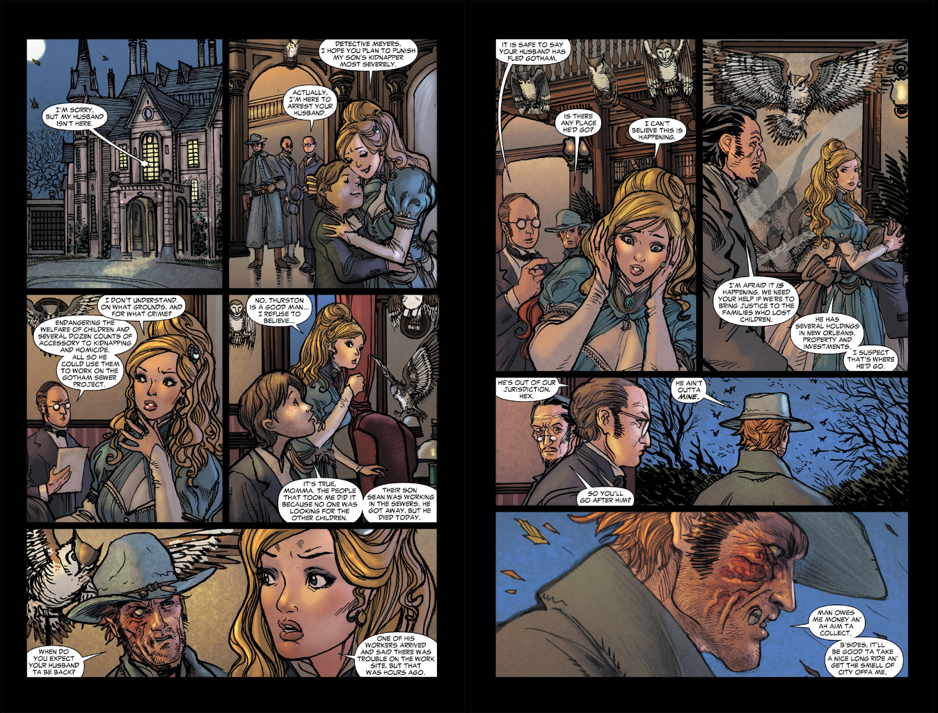 We pick up where issue 3 left off, with Hex back on the trail of the Trapps brothers, the original bounty that brought him to Gotham. Hex is then approached by a wealthy Gothamite who wants to hire Jonah to track down his lost child. Originally scoffing at the idea, Jonah accepts after being offered $50,000 (adjusted for inflation, this comes close to $1.1 million). His search takes him to an orphanage, where he is reunited with Arkham. After examining a boy who had been lost for 3 years, Arkham and Hex learn that lots of children from the nearby area have been kidnapped over the years by a man who could be an 1880s Red Hood. Given that boy’s appearance, Hex determines that they are somewhere underground. Arkham and Jonah venture into the Gotham sewer system to investigate. They happen upon a mine, Temple of Doom-style and proceed to attempt to take out the guards and free the children. The apparent leader of the goons grabs Arkham and threatens to shoot him.