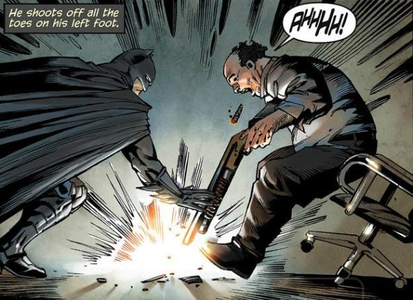 Tony Salvador Daniels pulls double duty writing and penciling this series all by his lonesome, so I guess I can forgive that both lack subtly. Some of Batman’s little voice-over bubbles are really poorly written and betray a Batman that’s just too douchey for my liking. He’s also kind of an asshole. In issue 6, he interrogates a sleazy motel owner. The sleaze-ball points a shotgun at Batman, who naturally turns the gun back on his TOTALLY NON-THREATENING OPPONENT and MAIMS HIM.