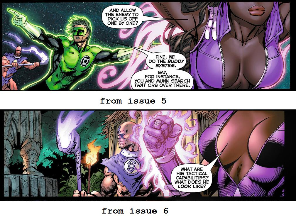 2. I didn’t mention this in the write-up, but this title has actually been a pretty great primer on the Emotional Electromagnetic Spectrum, with which I only had a very passing familiarity. It may be elementary stuff, but the first few issues got me up to speed on each of the colors as well as the nature and capabilities of the corps — all without feeling particularly expository. Patrick is right to suggest that the team dynamic here is helped by the fact that we don’t have the same baggage with the characters that we do for the heavy hitters in the Justice League. I don’t feel like any one character is getting short shrift, and their voices are pretty well defined (though, to be fair, the fact that they each have a pet emotion necessarily makes their characters distinct). I wonder if I’d feel differently if I knew these characters already.