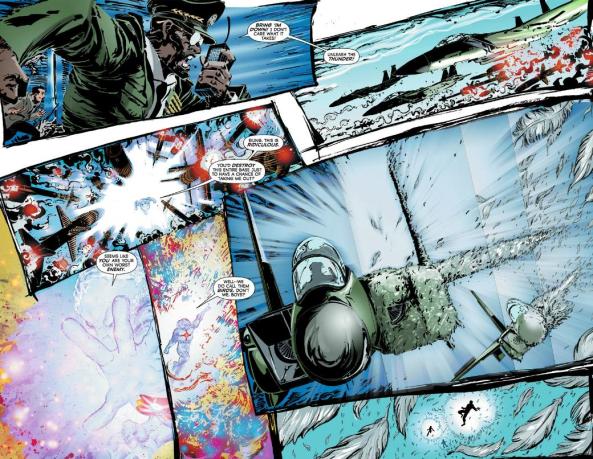 Click on that image and view it full size. I know, dear reader, that you don’t like me bossing you around, but do it – it’s fucking awesome. In particular, the panel/set of panels illustrating the progression from jets to feathers is incredible – the faintest of lines separates them mini-panels and the whole thing is very vivid and kinetic. As an added little bit of fun, look how the pilots that are left stranded in the air appear like dandelion spores in the sky.