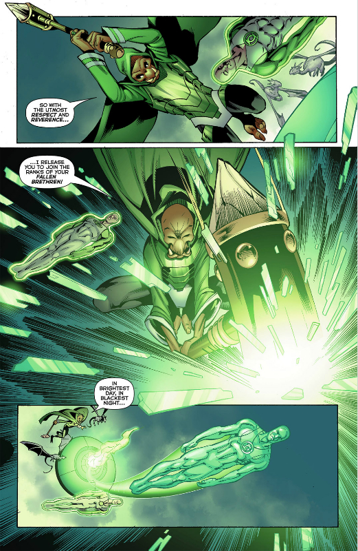 Best part of this book though is Morro’s ceremony. It was really cool to see that, and it gave me a chuckle, and tear. NERD ALERT. I think it’s funny that his hammer looks like it may be made out of wood, which he used to smash some green crystal. That makes me think of Alan Scott’s Starheart ring’s wood impurity, even though Alan’s ring is not connected to the Green Lantern Corps Central Battery at all.