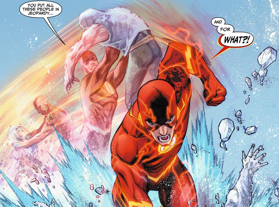 One last bit that I loved (that well is so deep in this issue): after Barry fails to rescue Iris, he decides the only thing that will make him feel better is getting in a few punches at his local Captain Cold. But Cold is currently struggling to survive, frozen and stuck in the water. Absentmindedly, Barry saves him and slugs him a few times. Now, the Flash is frequently drawn multiple times in a single frame to illustrate the speed at which he’s doing something, but this image of him lifting Cold out of the water and wailing on him is just exceptional. The composition, the color, the way those speed-lines from his fist trace the action of the sequence – it’s basically perfect.