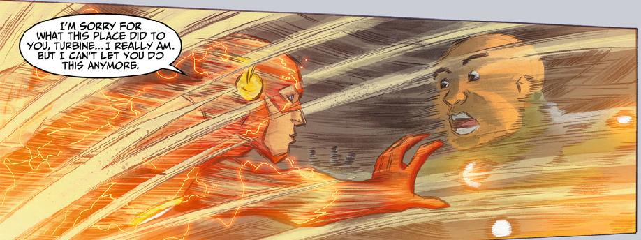 I mean hot damn: the art in this series! Even sticking to traditional rectangle-to-rectangle layouts, these guys manage to melt my mind with a great little panel where Flash and Turbine start to fade away into their own motion lines.