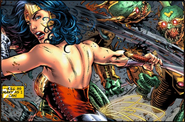 Wonder Woman, who lost all of Amazon Island in the war, comes off as as a one-track, KILL KILL KILL.