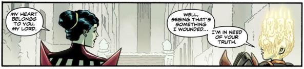 The issue opens with Strife sitting down with War to see if he wants to be her date to the big wedding. He declines, citing a one-wedding-per-person policy; he went to Hades first wedding, and that’s it. I guess Strife is going stag; she should have asked Lennox, because he is ready and rarin’ to go on a big rescue. Hermes opts out, because he has to keep Zola safe, which means the only way Lennox is getting into Hell is as Hephaestus’ date. Cute. In Hell, Diana is being tended by none other than Persephone, Hades’ first (current?) wife. Turns out, she tried to kill herself to get out of her eternal marriage, which didn’t work, because she’s married to the lord of the dead. Once Diana is dressed and looking AWESOME, she and her betrothed are riding their skinless horses down the aisle. Hades confesses a) He is incapable of love and b) He suspects that Diana is lying about loving him as part of a complicated plan to free Zola. He asks her if she would mind wearing her ring before the ceremony, to assuage his doubts, and she readily agrees. Turns out, the ring is a noose made out of her lasso; Wonder Woman must either truthfully confess her love, or hang.