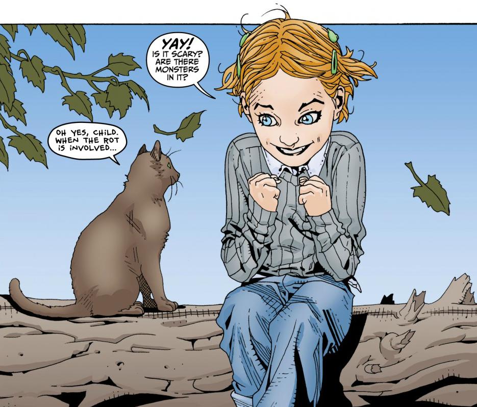 I’m also moved by how this issue portrays Maxine. She’s just a kid on a fun adventure with her talking kitty friend. But she finds the saga of Animal Man Jacob Mullins to be too sad – just like Jacob, she thinks the cost in lives is just too high. Socks is only trying to prepare THE AVATAR OF ANIMAL LIFE for the war to end all wars. I mean, for crying out loud: the kid just wants to hear a story with scary monsters.