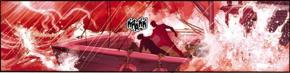 We also see more character development for Arthur. While he is fighting Manta, he acts more like he is depicted back when he was first with the Others – that petulant machismo asshole – than as the noble loner depicted in earlier issues. Also, when he kills Manta’s father there is that look on his face that really just gets me. It’s that mix of sadness and surprise, and extreme remorse. This issue also shows that he can have more mood swings than a pregnant woman. These two frames, beautifully done by Reis, show that.