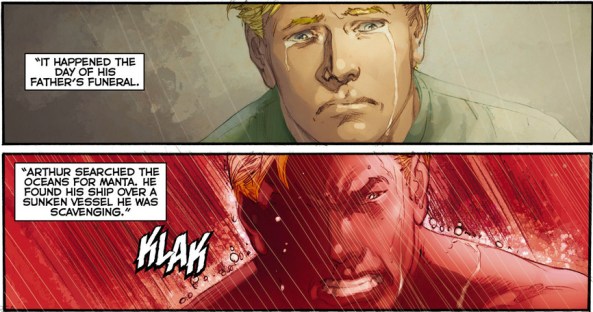 Shelby: Ah, the art in this book. On the one hand, you’ve got those beautiful panels of flashback within a flashback: the red Manta-vision when Arthur killed Manta’s father vs. the soft and painterly treatment of all the Thomas Curry flashbacks. On the other hand, though…
