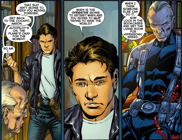 This really speaks to his character, and hopefully will guide how he will behave in this book. Side note, I love that the suit is what keeps him moving, but also will gives him a vice; without the suit, his body is shot to hell. His relationship with his son is a good dynamic, but I don’t really see that playing a major role in this story.