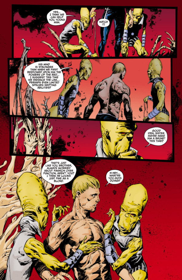 The issue begins with Buddy getting fitted for his “replacement flesh” by the Red’s Royal Tailors. They opt to upgrade him to “limited species-shifting abilities,” which actually alters his physiology to give him the animal powers he’s tapping into. This means he elongates when running like a cheetah, sprouts wings when flying like a bird, gets all huge and horned when charging like a rhinoceros, and bulges with muscle when raging like a gorilla. Those are awesome, monstrous moments, sold entirely by Alberto Ponticelli’s pencils, which paradoxically pays tribute to the Animal Man house style while looking totally unique.