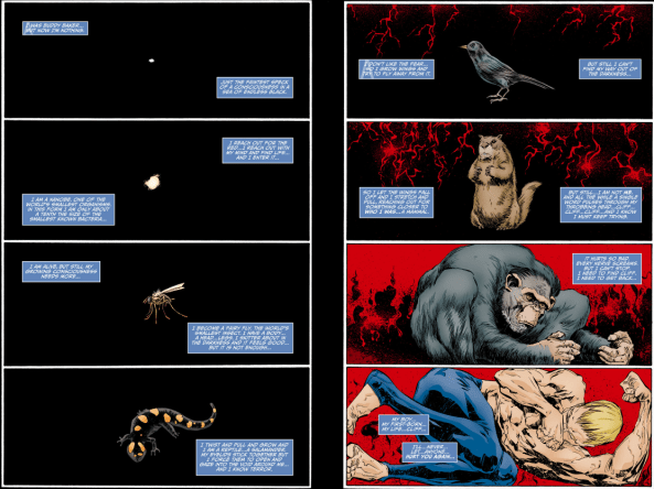 My favorite part of this book is the two page spread of evolution. As the biologists around here, you and I both know that this is not your standard evolutionary sequence. However, as he becomes more mammalian and closer to human, the individual panels moves from black the red. It’s as if he evolves and becomes closer to human, his connection to the Red grows.