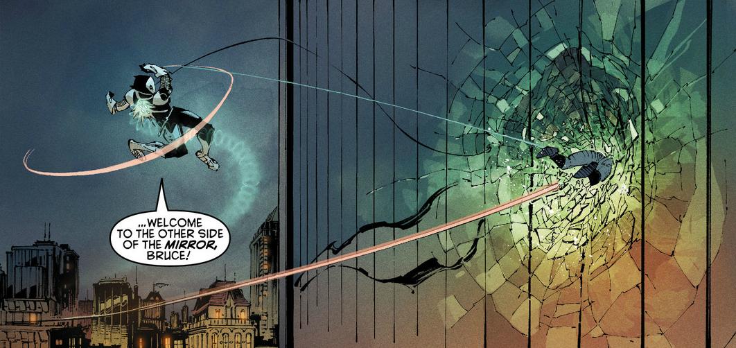 Owl Man slams Batman into the side of a building.