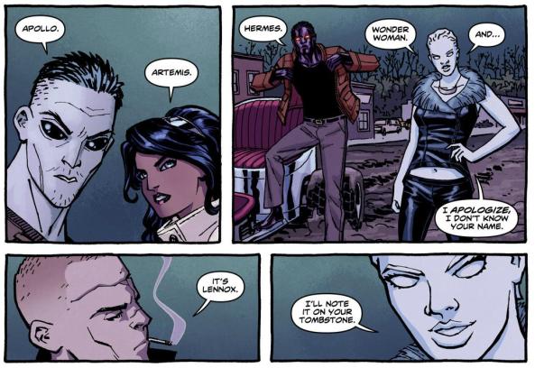 Fresh out of hell, Wonder Woman, Hermes and Lennox take Zola to her family doctor in rural Virginia — she is magically-fast-pregnant with Zeus’ baby, recall. Hermes is less than thrilled the relative shit-hole they find themselves in, but the immanent danger isn’t the crumminess of the clinic but the incoming hostile gods. You see, Hera contracted the twins, Artemis and Apollo, to find Zola and bring her back to Mount Olympus. They’re a pair of bad ass gods, so even the combined forces of Diana, Lennox and Hermes (with two separate assists from preggsies Zola) can’t turn them away. The twins take the young mother back to Hera’s throne room and Apollo is about to claim his prize as King of Olympus when Hermes and Wonder Woman appear, ready for round two.