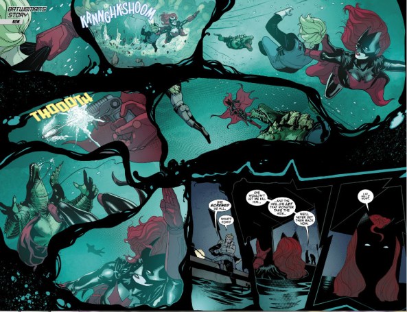 The issue begins with Batwoman confronting Sune/Maro, who is a bit drunk on power after killing Falchion. He/She explains this was all part of her plan, and there’s nothing anyone can do to stop her. As she sets to teleport the kidnapped children somewhere, Chase shows up and tries to shoot Sune/Maro. Kate naturally objects, and zaps Chase with some taser gloves, causing her shot to only wound Sune/Maro, who teleports away with the children. This leaves Chase and Kate in the flooding lair, but they get out with only a little interference from Croc. Chase surfaces to find Maggie, who’s sympathetic to Chase’s newfound hatred of Batwoman.