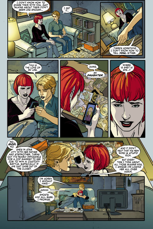 I’m also a little relieved the multi-story weaving is at an end. It was an interesting way to tell a story, but I also found it to be distracting and difficult. Not just to read in the moment, but for story retention as a whole. I sometimes struggle with remembering what has happened month to month with comics, and this was one of the titles I found to be the most challenging, simply because the story was doled out piecemeal in the wrong order. This is frustrating because I like Kate Kane a lot. Like Batwoman, she is a realistic woman struggling with her personal relationships as they intersect with a fantastic secret life. I love the conclusion of Kate’s Story; the family photo sharing time, the “I don’t want to keep any secrets from you” confession, I’m a sucker for those reality-based, character building moments. I even liked Bette’s story: not because I liked seeing her get hurt, but because you almost never see the actual, physical repercussions of what these people do at night.