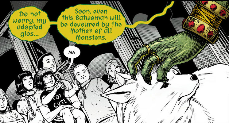 Meanwhile, back at the hospital, the doctors are preparing to harvest Bette’s organs. Colonel Kane makes one last impassioned plea for Bette to wake up — this time with the aid of her own mask — which miraculously works. The next day, Kate and Maggie begin to share a bit about their pasts. Kate shares a bit about her family, but conveniently leaves out that whole “I’m Batwoman” thing. Maggie reveals that she has a daughter who lives with her father in Star City. The issue ends with a strange epilogue, where Sune/Maro delivers the oddly happy kidnapped children to some unseen monster called “Mitera.”