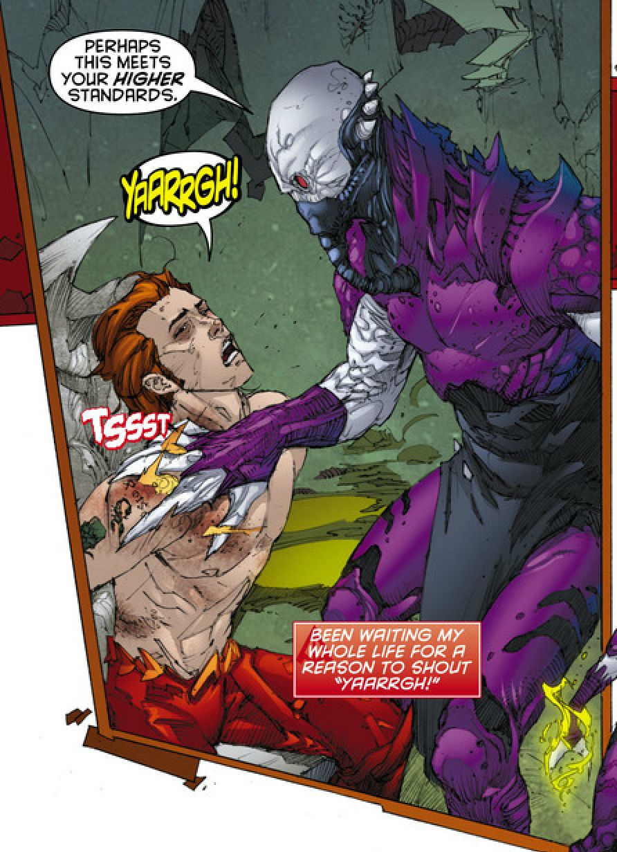 Patrick: Much as I loves me some Jason Todd, I have to agree with you about the breath of fresh air the shift in focus brings. RHatO always plays it fast and loose with chronology, but couching Kori’s story within Roy’s story — and having him point out that absurdity — is fucking great. Roy’s telling the story he wants to tell – it’s literally the only power he can exercise in a situation where he is bound and tortured. It’s not revelatory character work, but it’s just the right kind of detail to make me even more invested in the character.