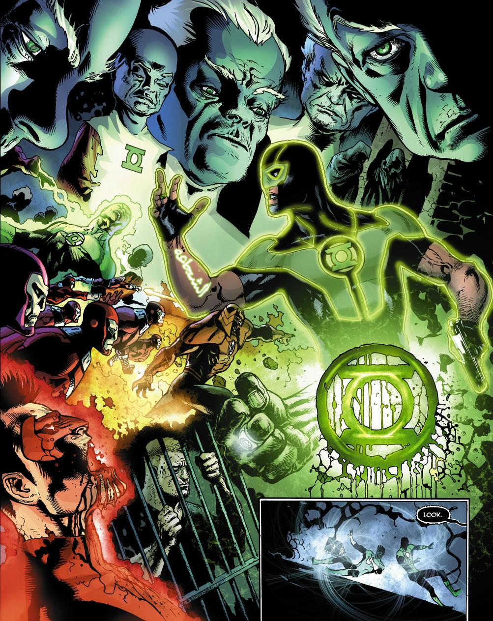 One of the first things this issue does is establish some new-old norms: Sinestro is back to being a Green Lantern and Hal’s ring is no longer subservient to Sinestro’s (Indigo Lanterns have all kinds of powers I don’t understand). But Sinestro’s freaking out about another possible return-to-form, and he insists they figure out what happened Black Hand. But when all they discover is a gooey black splat on the rocks, our boys fear the worst and have Indigo-1 spirit them away to Korugar. Back on his home planet, Sinestro is able to access his super cool secret base (where he interestingly stores both his Green Lantern and his Yellow Lantern). Locked up in an even secreter vault is the Book of the Black, which Sinestro believes will give them insight into the Big Bad that’s on its way in the wake of Blackest Night. Only, that’s not what the book does…