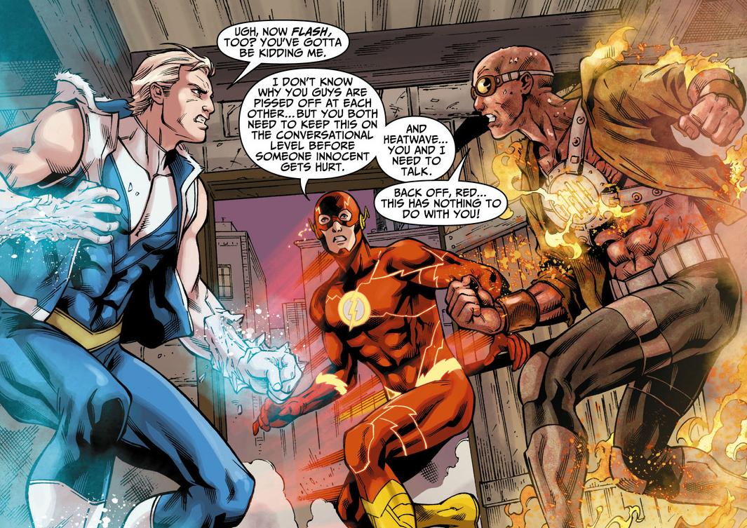 You can also tell that Manapul and Buccaletto delight in squaring Cold off against Heatwave. They know full-fucking-well how nice it looks to place these characters on opposite ends of a panel. Drop the Flash in there for good measure, and you’ve got a damn graphic action sequence on your hands.