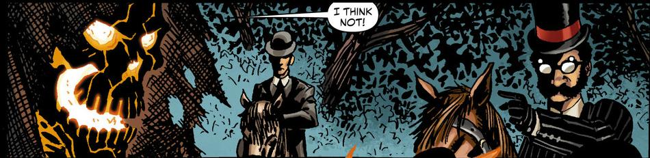 The Dr. Thirteen story is fun. I mean, it looks to be setting up a Scooby-Doo conclusion, but it’s always nice to have a skeptic hero. I hope to high-heaven that there isn’t a moment where he suspects that they really are fighting some kind of demon – that’d be lame. I also love that Thirteen is a big enough nerdlinger to a) hang out with Amadeus Arkham and b) wear his scientific jewelers glasses while out riding his horse.