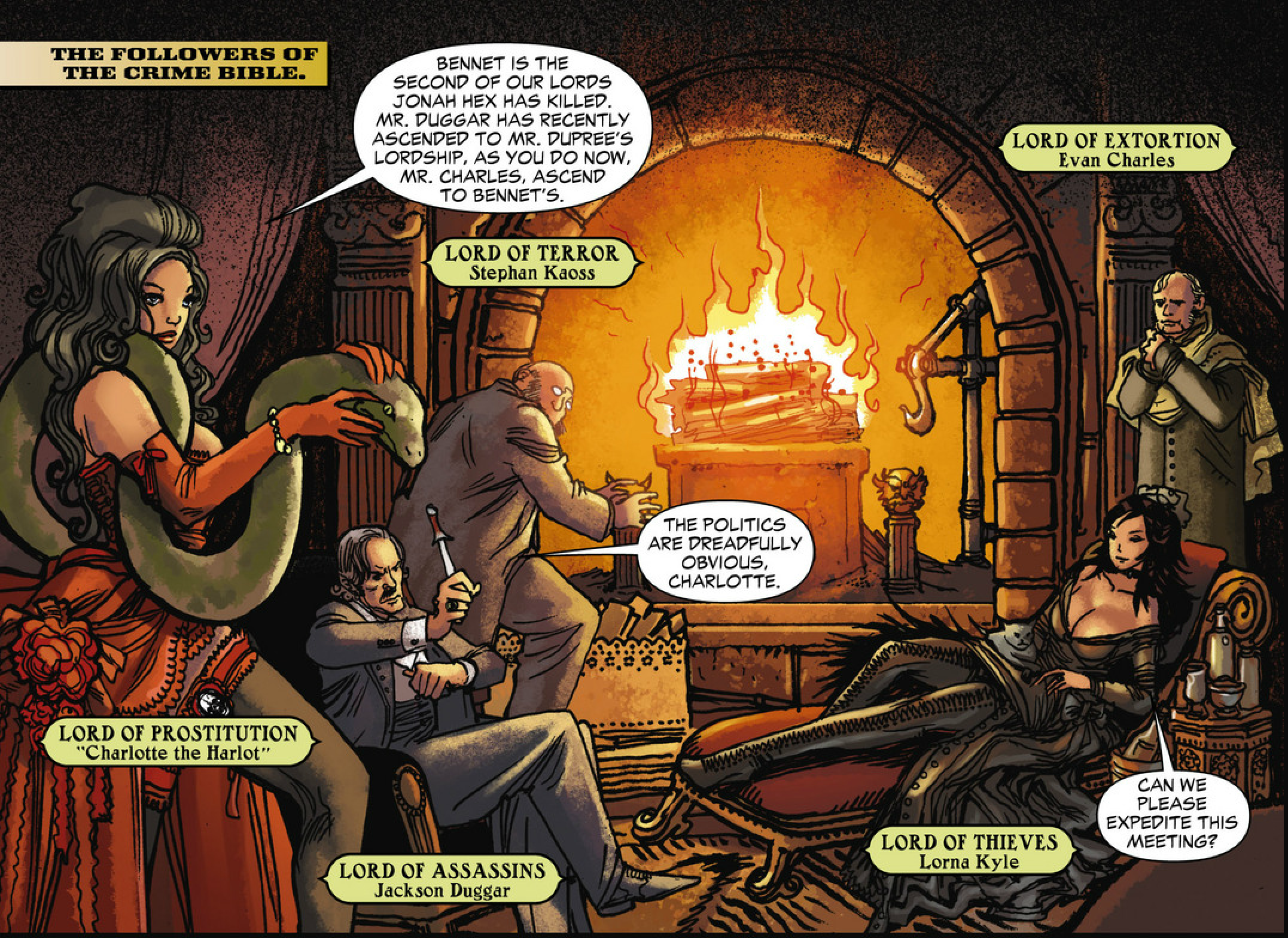 Since the Religion of Crime’s introduction, there have been these different ‘houses’. Looks like these are the 1800s versions. Some of the names sound familiar to me, but one obviously sticks out, Lorna Kyle. Could this be Selina Kyle’s ancestor? It would make a lot of sense, especially since she is the Lord of Thieves. Plus, she even has a cat on her lap! The other lords seem rather unassuming, which also makes sense, since members of the Religion hide in plain sight.