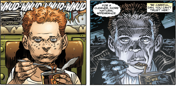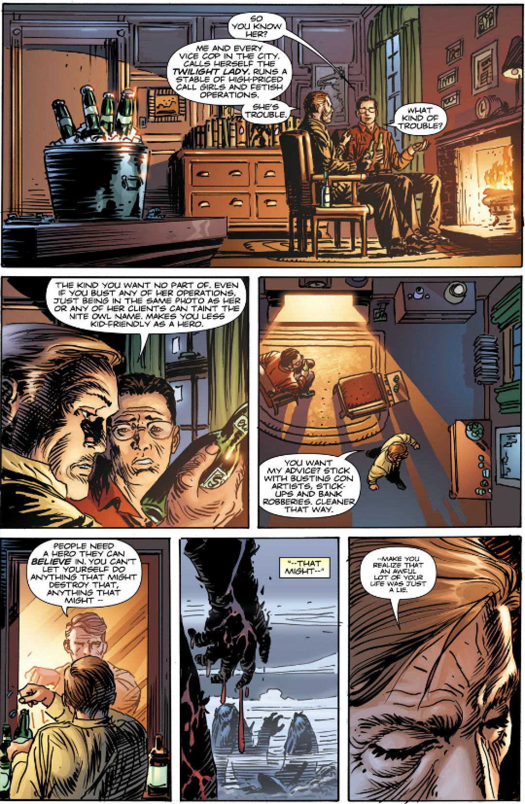 One of my favorite scenes, and probably the only good one in this issue, is Dan’s conversation with Hollis. I like that it sets up Dan’s continuing relationship with Hollis.