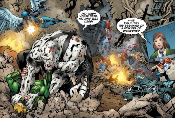 I don’t mean to give the impression that I didn’t like this issue. It’s still remarkably fun and paced within an inch of its life. A lot of that comes across in Nicola Scott and Eduardo Pansica’s art, which is always clean and shockingly adept at portraying scenes of devastation involving several characters. This panel demonstrates what I’m talking about pretty well: