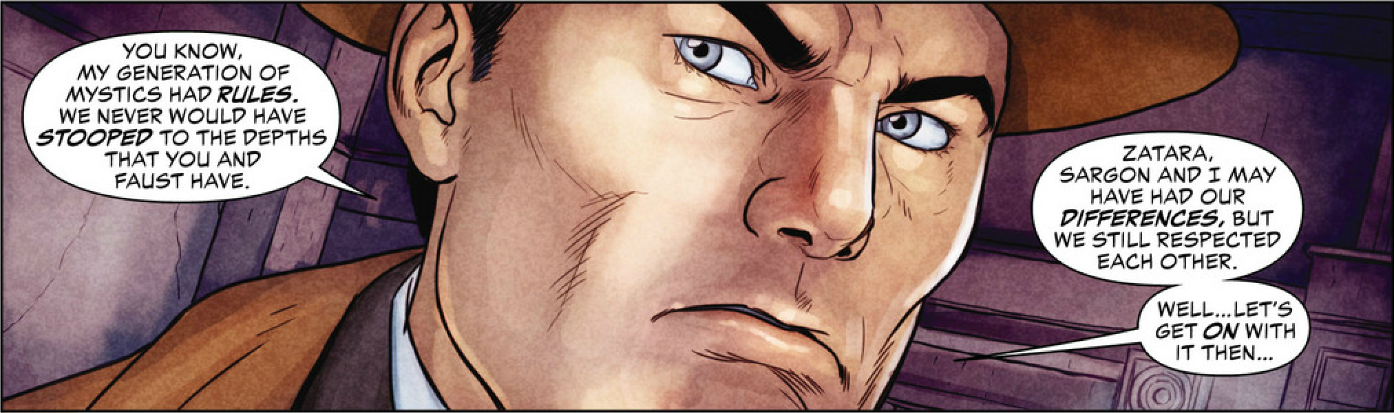 Second, there is the subject of this mystery man that is working with Faust and Mist. We know that he already knows many members of this mystical community — Constantine, Faust, Zatanna, Dr. Occult, etc — maybe even everyone, but has a clear history with these AT LEAST. Also, with some name dropping, and other context clues, we can figure out who it is not. First, it may or may not be someone at this table.