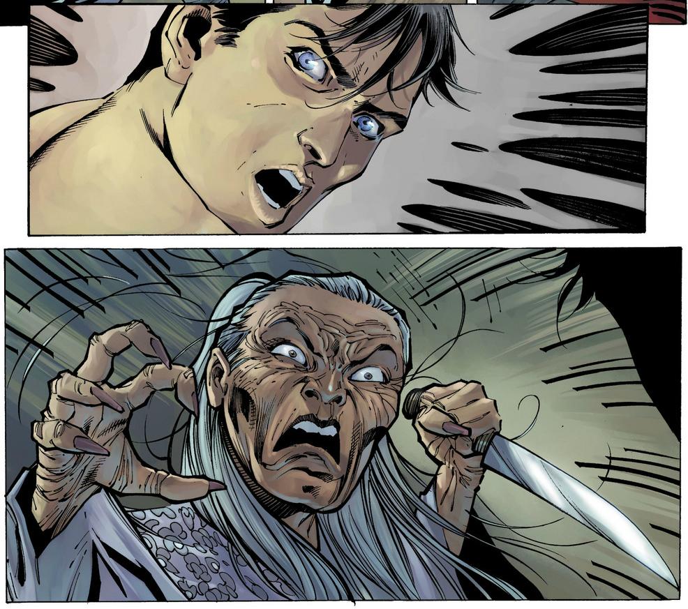 I haven’t even mentioned Mio yet, but there’s not a whole lot to say. Are we really supposed to believe Bruce traveled halfway around the world to study under Shihan, but then ignores everything he is taught as soon as a girl offers him an apple and tells him to smile? And I guess it’s supposed to be a shock when she’s revealed as the assassin, at least it is for Bruce, but it’s hard to call it a twist when the killer turns out to be literally the only other character Bruce interacts with up to that point. I mean, they didn’t give us much reason to suspect she was under the mask, but they also didn’t give us anyone else to suspect. It’s an incredibly tidy way of reinforcing Shihan’s mantra about shutting yourself off from closeness. This whole reveal sequence does provide my favorite series of images in the issue, however. I especially like Bruce’s expression of utter shock as he turns to see Shihan’s wife standing over him with a knife, just because of how silly it looks.