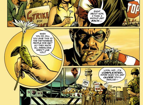 Peter, you’re right to point out that all the Watchmen characters have an effect on the politics and policies of their day, but none seem so well integrated into history as The Comedian. The two previous issues have both very explicitly shown Eddie’s role in two specifically American historic moments: the JFK assassination and the Vietnam War. In both of these situations, Eddie acts as a product of the time and the culture. He’s appropriately devastated by JFK death, and while he engages in some gruesome tactics in Vietnam, y’know, it’s a war. And more pointedly, Vietnam vets always have these ultra-grisly, hyper-violent stories — and it’s those stories that are like Eddie’s experience. Effectively, Eddie is America.