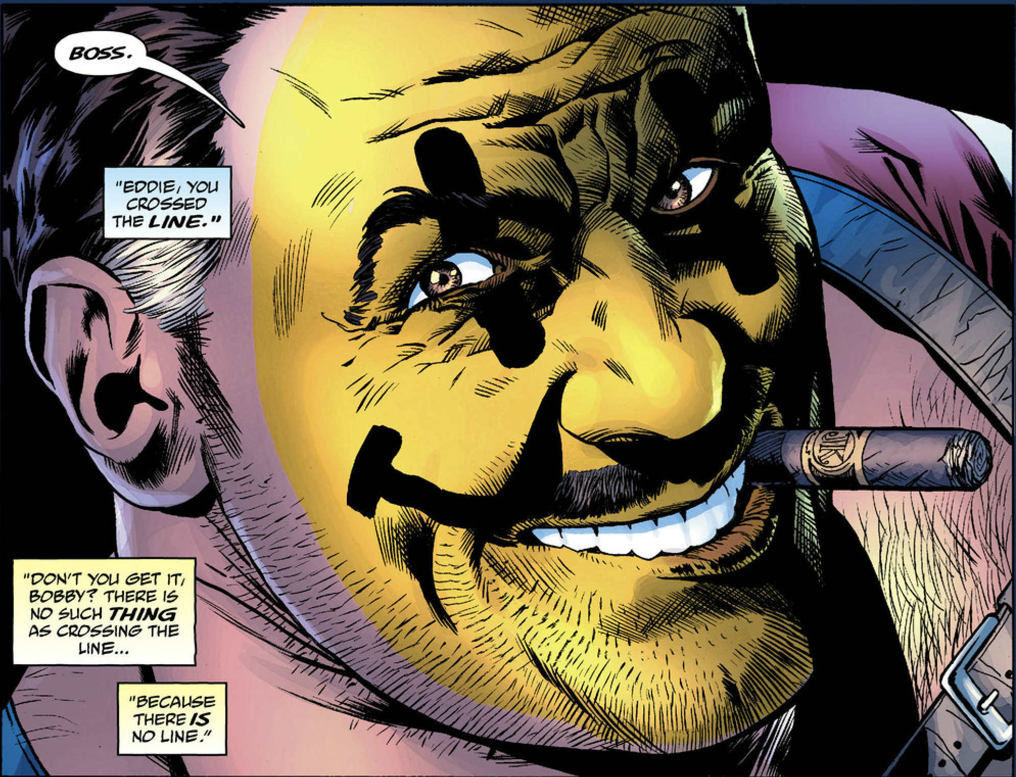 Patrick: Oh, man — I can’t begin to convey how much I disagree with your last sentence, Peter. Eddie doesn’t represent the lighter side of things at all — he is the darkness. He’s the inescapable truth that “there is no line.” And that’s a philosophy that Azzarello’s min-series embraces with alarming zeal.