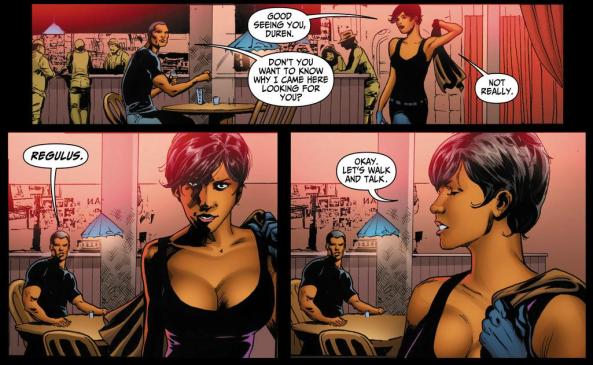 This exchange is a MASSIVE cliche, but can we just break it down for a second? Amanda must know that if Duren said “Regulus” she’d be interested. She also must know that, if Duren went to the trouble of finding her, he must have something important to say to her. If there was anything she thought Duren could say that might interest her, why would she act like there wasn’t? Did she forget that Regulus — the person so scary she’d come out of retirement, mind you — existed, or is she just being needlessly dramatic?
