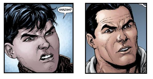 In fact, I was really impressed by how similar the characters of pre- and post-transformation Billy are. Obviously there’s no trick to writing them the same, Johns — perhaps empowered by his current position at DC — writes a kid with immeasurable power like it’s second nature. Billy smashes thrones, throws cars — even rescues someone from a mugger, just so long as he can also get a twenty, maybe? It’s cute and totally consistent with the character. But it’s the physical similarity between boy-Billy and man-Billy that I love the most. Look at these faces. Definitely the same person — just, y’know, superpowered and all-grown-up.