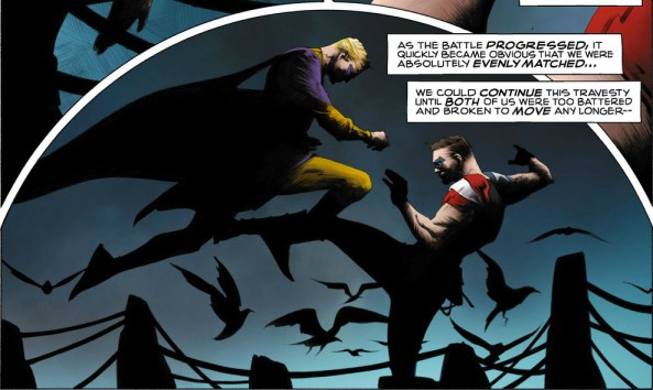 Okay, so this fight taught him how to beat Blake, but “I had allowed him to win”? Um, no you didn’t. You couldn’t beat him. You said so yourself. I’m left with the distinct impression that Wein only put that “evenly matched” bullshit in so the two could fight for a while, even though it makes absolutely no sense.