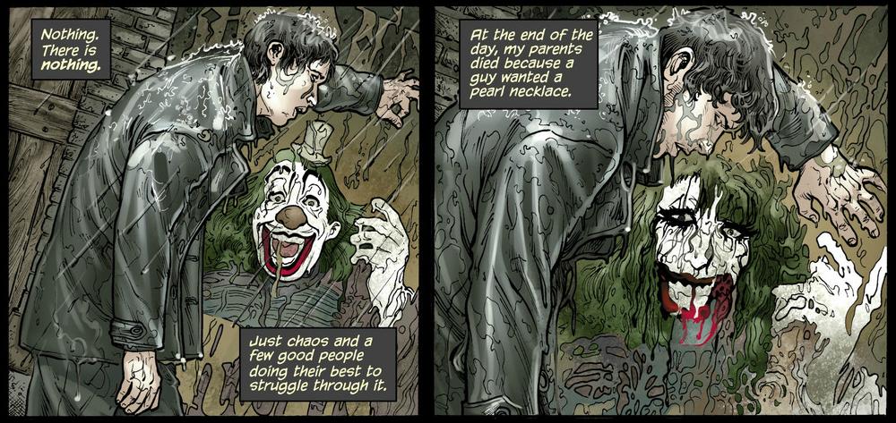 The dissolving clown mural was simplistic and unnecessary. However, the image of the Joker on the final page amid an inner monologue of chaos and nihilism gives us the point of the story in unambiguous terms (as to your point about graffiti, I wouldn’t doubt that it rains acetone in Gotham, though that would just make the cloudy eyed beggar’s survival more problematic…). Somehow, Bruce Wayne misses the message, saying, “I can’t help but wonder what else [the big bad world] has waiting in its dark alleys, peering out with glinting eyes and a bullet in the chamber.” The story tells us that we cannot know. The world is senseless and chaotic. Nothing about the origin story Hurwitz gave us would motivate someone to find the secret machinations behind closed doors. You don’t battle chaos with logic. You merely try to deal with it.