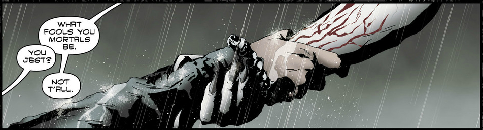 But you’re probably more distracted by the “What fools you mortals be,” line, which is a pretty clear paraphrase of Puck’s line from A Midsummer Night’s Dream. Most historians believe that play premiered in the mid 1590s, a good few years after the events of this issue. Cain can’t be making a knowing reference, so this allusion serves no purpose other than the cheap glimmer of recognition. Fialkov isn’t interested in rewarding that recognition, however, offering no other thematic ties to the play at all.