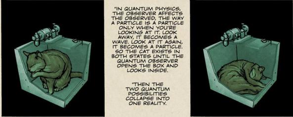 No, and I think that’s what Mike’s saying – he says specifically that he DID enjoy the issue. I guess what is sorta frustrating is that there are phenomenon to express what’s being explored here (as Mike listed, both Chaos Theory and the butterfly effect come to mind). What probably makes Schrodinger’s cat the most viable option for comic book purposes is that it’s the most inherently graphic model – any time there’s a box and/or a cat, you’re evoking the main themes of the piece.