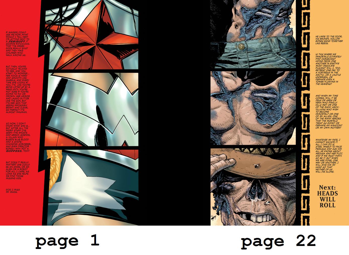 As far as Wonder Woman herself is concerned, well, I didn’t want to be rude, Patrick, but since you asked: I don’t dig her, never have. I think she’s well-integrated into this issue, so I have no complaints on the score of craftsmanship. I have always found her apparent invulnerability and unflappability pretty uncompelling, in the same way that I do not enjoy Superman. This is, perhaps, a me-problem, but there it is. To its credit, this issue calls Wonder Woman’s uncertain, contemplative side to the forefront. Unfortunately, that contemplation is about the stresses of not quite being immortal, so it’s still hard to empathize.