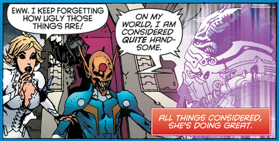 I thought Isabel’s comment about “never fill[ing] out a space suit” as well as Kori was particularly goofy, given that the two characters are drawn with essentially the same body type. As long as this arc was an excuse to put Starfire in something a little less revealing (hopefully permanently), I’m glad it happened. Too bad they couldn’t do the same for Kom.