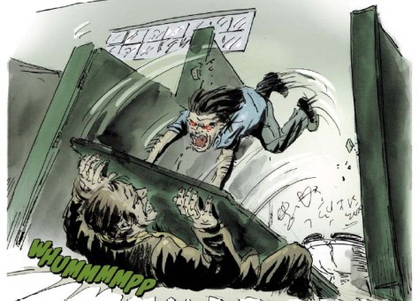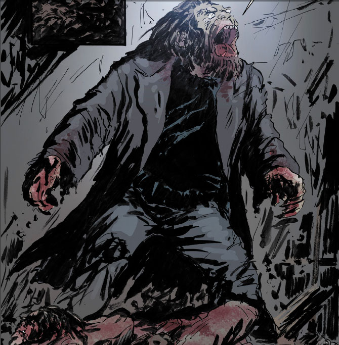 The Dwellers are a race of monsters, lurking in the shadows. Think a cross between a human and an angry silverback gorilla. There’s an uneasy truce between humans and the Dwellers; the Dwellers only come out to hunt at night, and in exchange, the humans leave them alone and pretend like they don’t exist, so it’s a real win/win. That particular Dweller is King, and he wants his throne back. His vision for his people is sovereignty; no more hiding in the dark for him, he wants to rule over his people in broad daylight, and he plans on doing so with his son Ben, seen above sleeping on Foster’s couch. You see, about 7 years ago, Ben’s prostitute/junkie mom hooked up with King, and the rest is history. Trina and Ben lived across the hall from Foster, and when Trina went missing, Foster took Ben in. Now the two of them are on the run from King, who wants his son back, the Dwellers, who want Ben and King dead so they can continue to live in relative peace, the cops, who think Foster killed Trina and kidnapped Ben, and Dr. Marjorie Fisher, a genetic scientist who sees Ben as a guinea pig for her to study.