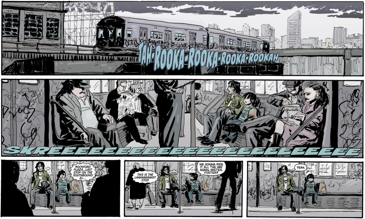 Much of the desperate boredom is written, but Tauzon does well to provide us with big panels that isolate our characters long before they’re alone on the train (Buccellato’s subtle character work gooses the effect even further). It’s one of the most idiosyncratic uses of a double page spread I’ve seen, making a strong case for the kinds of risks you can only hope to see in independent comics.