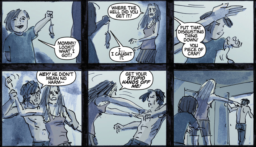 Booch’s colors are also just incredibly expressive. Much of the series has that kind of flat, gray-washed coloring, but there is also liberal use of that watercolor-esque coloring when going for more subtle emotional moments (like that flashback sequence Drew posted).
