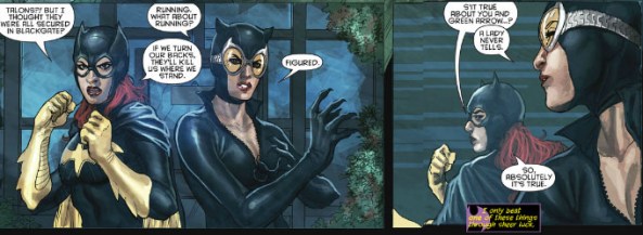 And man, this WAS an excellent book, wasn’t it? You guys got to all the many big excellent points of this issue, but there were plenty of small moments I loved too: The Batgirl and Ricky kiss, rooftop Bat-motion detectors (someone on Tumblr came up with a theory that those motion detectors were sold by a subsidary of Waynetech, which is why they don’t work, and that Batman follows up on everyone who buys them; Gail Simone read and reblogged the theory jealous that she didn’t come up with it, heh), speculation on Catwoman hooking up with Green Arrow…there was a lot to love in this issue, the best of all being three excellently characterized ladies getting to kick ass.