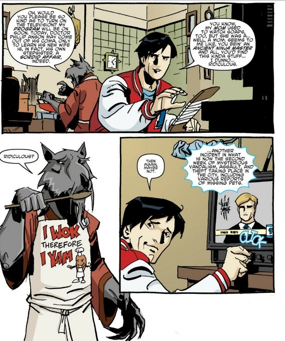 Patrick, you also mentioned how most of the these issues deal with the interpersonal relationships among the turtles, their human friends, and, most importantly, Splinter. I’ve been really pleased with the treatment the Splinter character has been given in this series and the way he relates to the rest of the characters. In most TMNT renditions splinter is the wise master of the turtles but not much more; he raised them, trained them, and is a father figure to them, but that is really all the depth the character had. Splinter normally serves as a convenient explanation for why the turtles are schooled in the way of the ninja but besides that he is an afterthought. Conversely, in this latest edition of the turtle story Splinter is a well rounded character who actually moves the plot forward in more ways than one. The argument could be made that there would be no plot whatsoever if it weren’t for Splinter and his centuries old feud with Oroku Saki but this isn’t the only influence he has on the story. When Raphael runs out to beat up Casey’s dad one would expect Leonardo to chase after him since this is the narrative we are used to when it comes to TMNT. But in this series Splinter is the one to do it because aside from being a rat of thought, he is a rat of action. His confrontation with Raphael gives us insight into his own dark past and further establishes his role as mentor, and more importantly, father figure. He also adopts Casey, an action which warms my heart and establishes him as my favorite character of the series. Those two being domestic together is simply awesome.