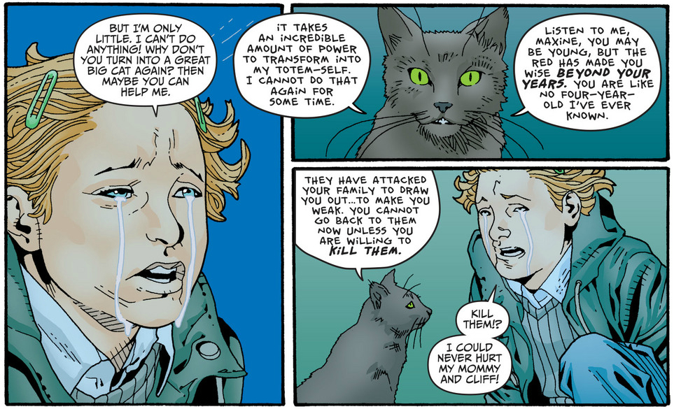 But enough about what others may or may not get — this was an exhilarating issue. Steve Pugh continues to bring the creepy crawler character designs for the Rotworld sequences, including a hilariously mobile head, straight out of John Carpenter’s The Thing. The sequence that really kills me, though, is Socks’ pep-talk to Maxine, drawn by Timothy Greene II.