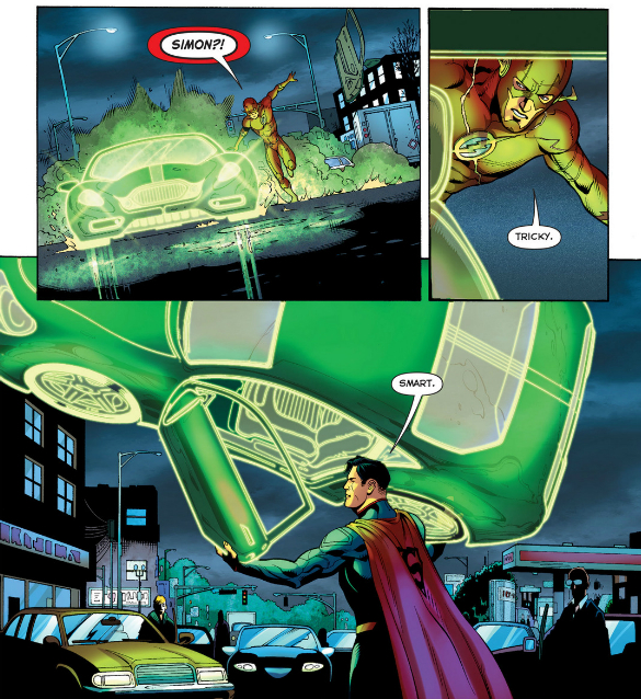 OF COURSE nobody thought to write down his license plate number“Tricky” and “Smart” are not words we always associate with Hal Jordan, and I love that Simon is being characterized so differently. Watching Superman bust through more ring constructs wouldn’t have been particularly exciting, but seeing the ring deployed in new ways made for a great sequence.